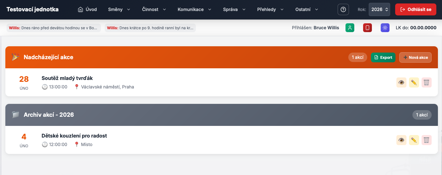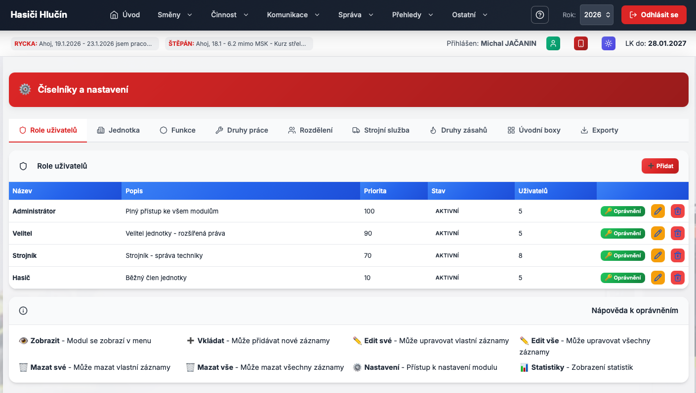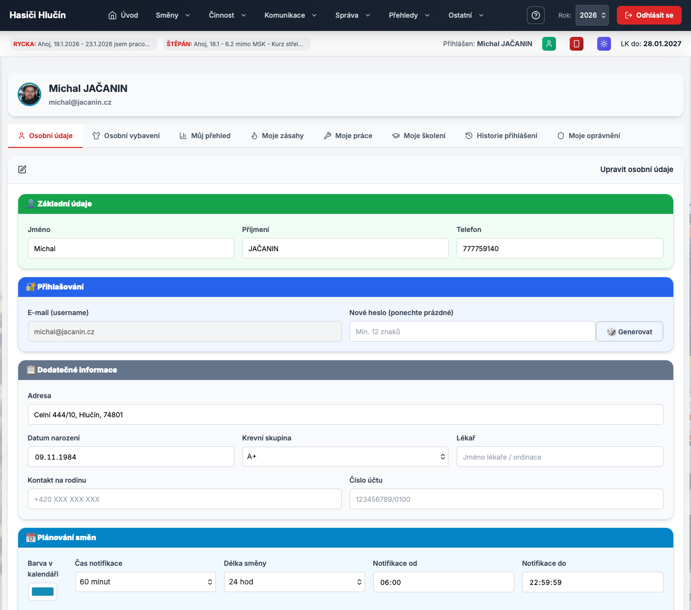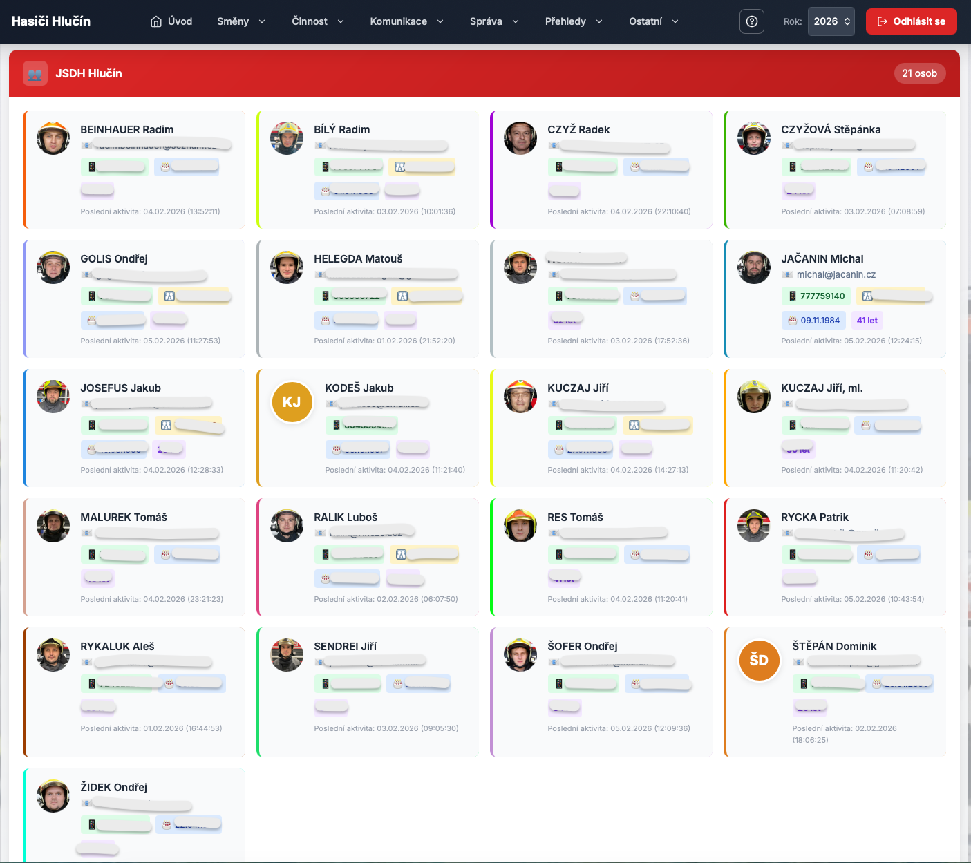 Tento dashboard nie je len rozcestník do ďalších modulov, ale predovšetkým osobný kontrolný panel každého člena jednotky. Veľmi rýchlo tak každý pozná, čo má splnené a čo je potrebné doplniť. Zároveň systém upozorňuje napríklad na slabé heslo alebo iné dôležité skutočnosti týkajúce sa používateľského účtu.