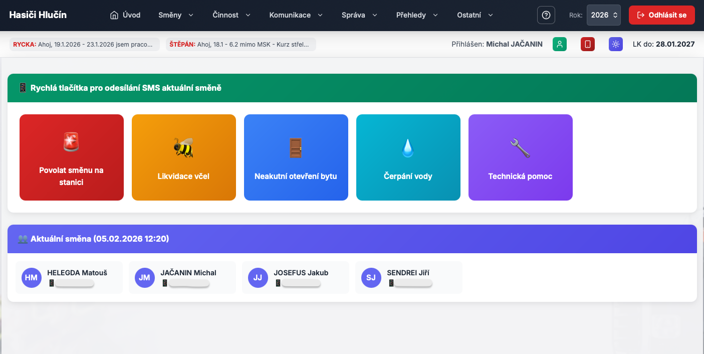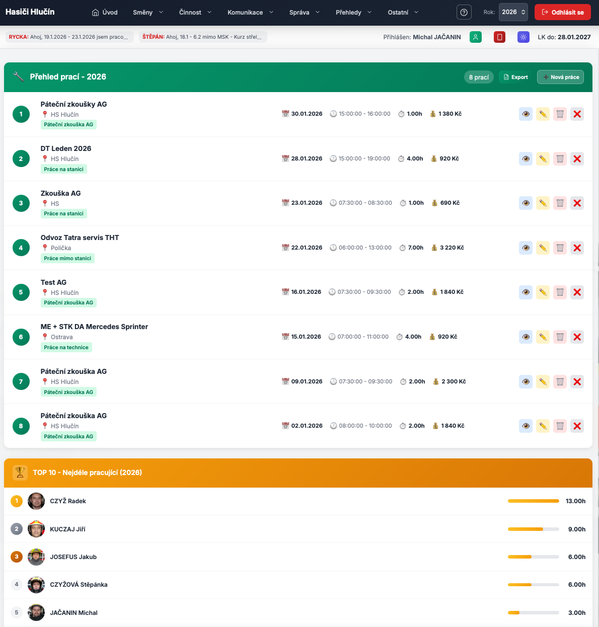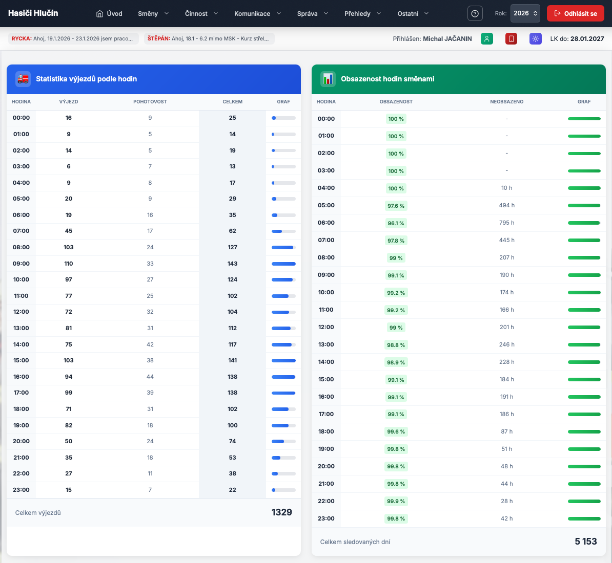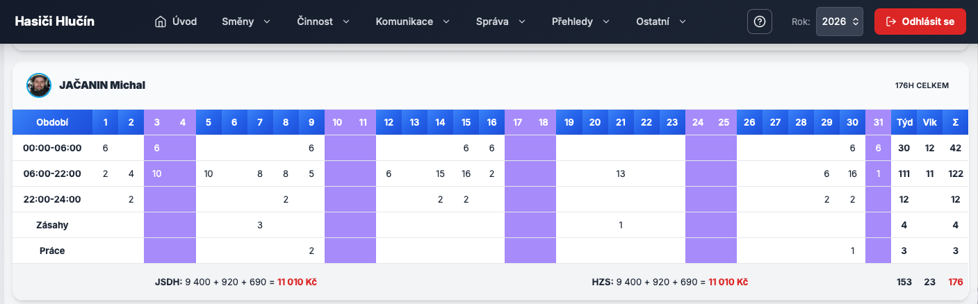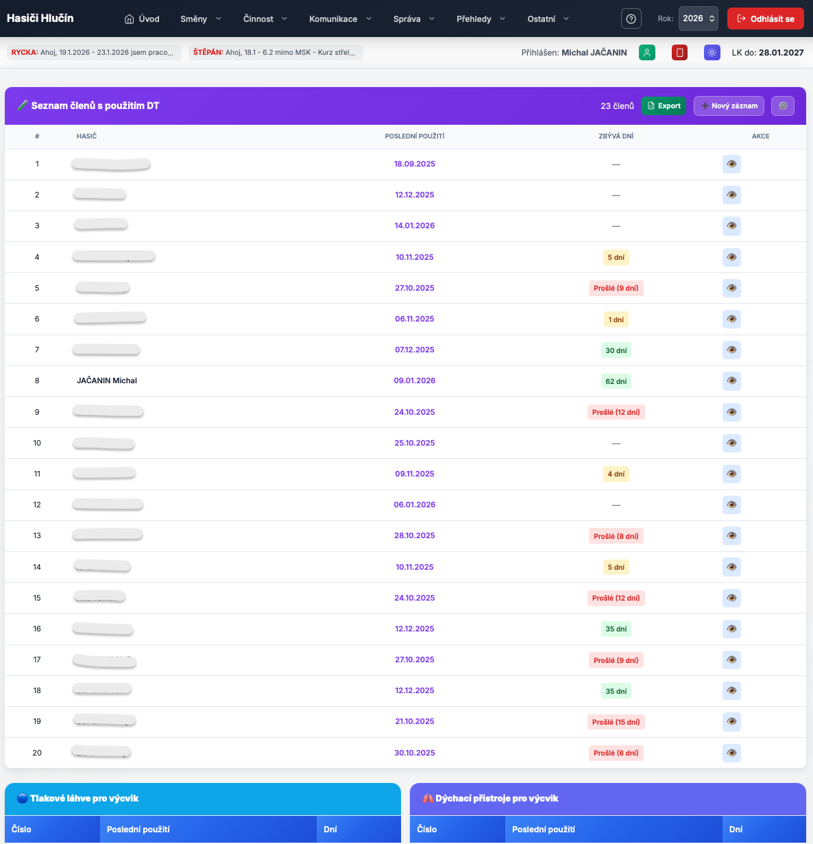 Po prihlásení do systému sa hasič dostáva na prehľadnú úvodnú obrazovku, ktorá mu okamžite ukazuje, či plní svoje povinnosti voči jednotke. Na jednom mieste vidí, koľko hodín má v danom mesiaci odslúžených, či absolvoval piatkovú skúšku techniky, či má splnené kondičné jazdy a či v poslednej dobe použil dýchaciu techniku v rámci chemickej služby.