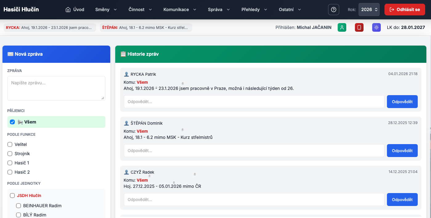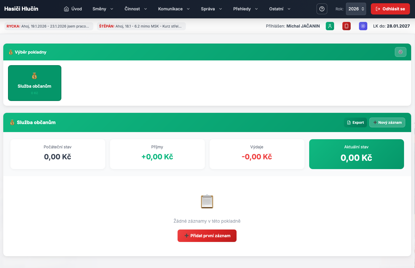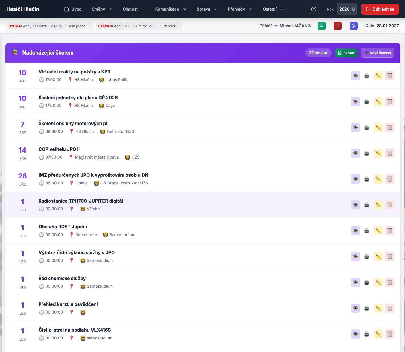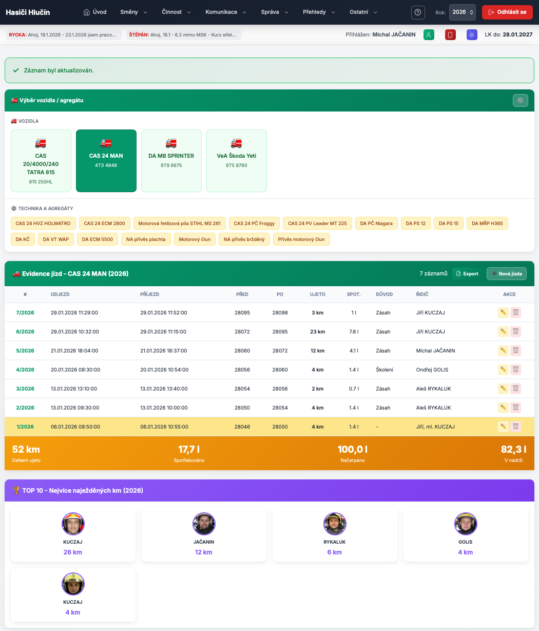 Po prihlásení do systému sa hasič dostáva na prehľadnú úvodnú obrazovku, ktorá mu okamžite ukazuje, či plní svoje povinnosti voči jednotke. Na jednom mieste vidí, koľko hodín má v danom mesiaci odslúžených, či absolvoval piatkovú skúšku techniky, či má splnené kondičné jazdy a či v poslednej dobe použil dýchaciu techniku v rámci chemickej služby.
