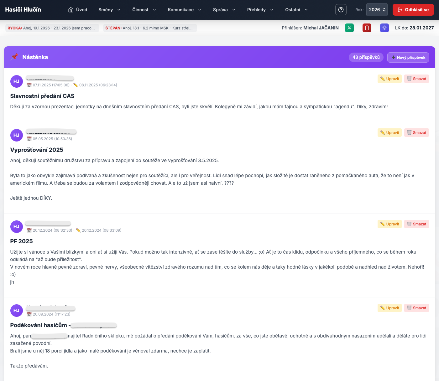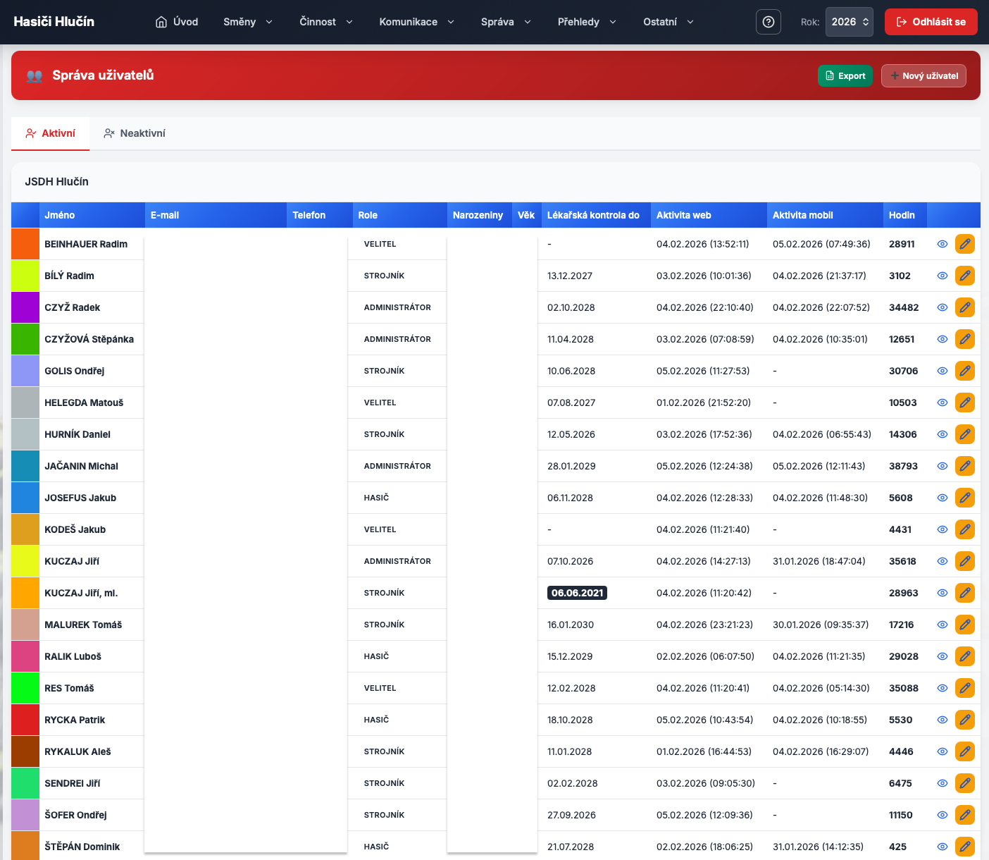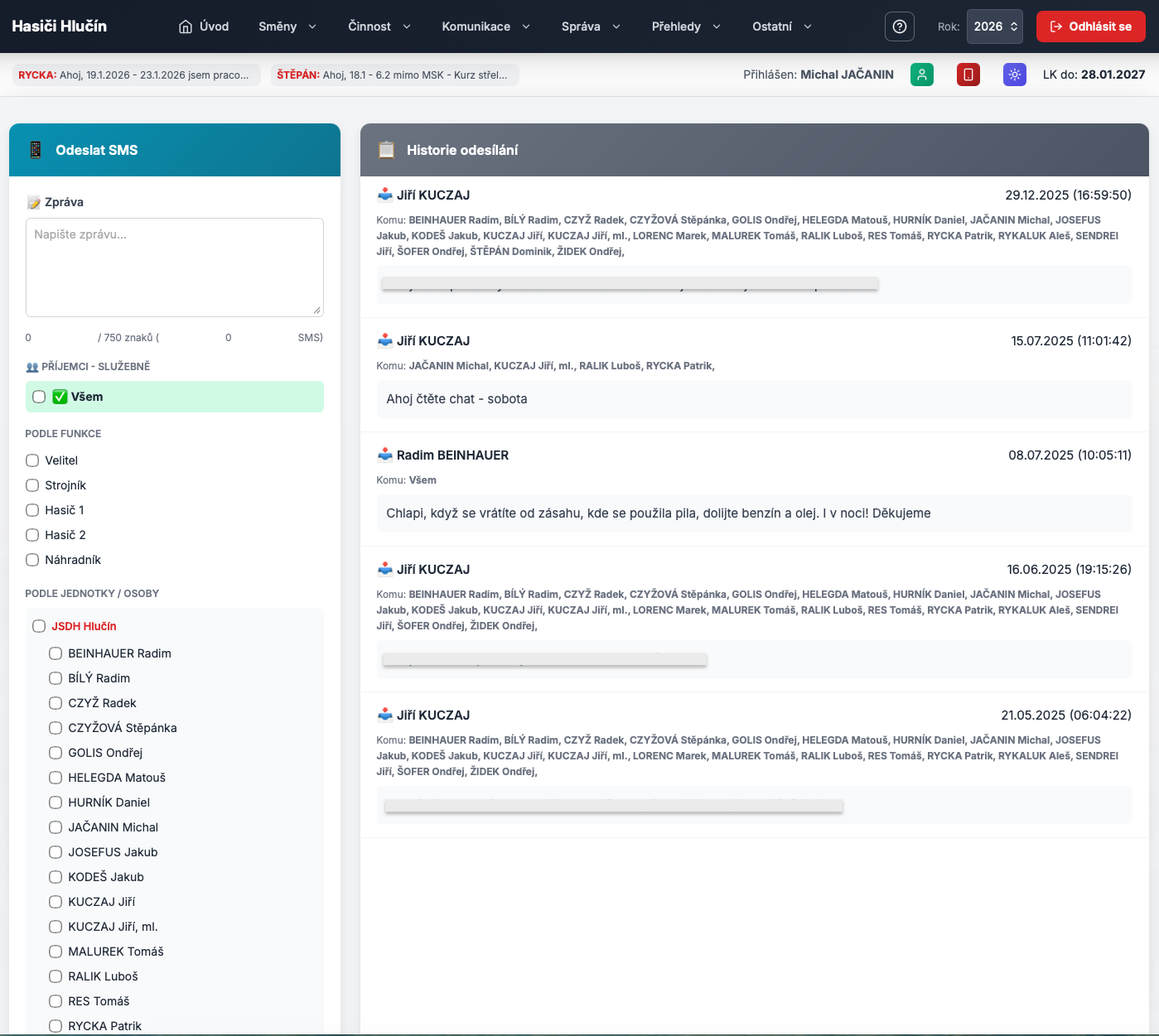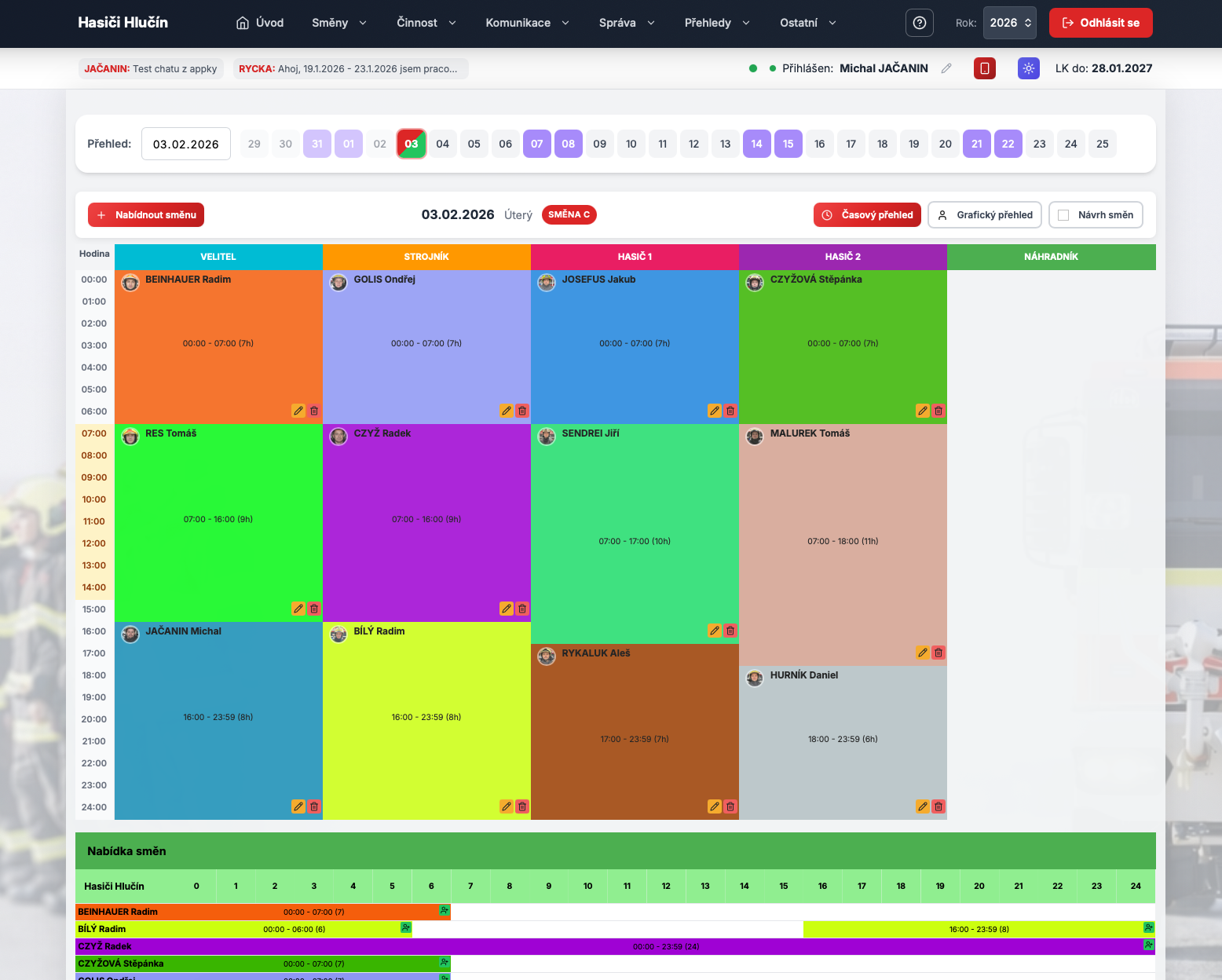 Po prihlásení do systému sa hasič dostáva na prehľadnú úvodnú obrazovku, ktorá mu okamžite ukazuje, či plní svoje povinnosti voči jednotke. Na jednom mieste vidí, koľko hodín má v danom mesiaci odslúžených, či absolvoval piatkovú skúšku techniky, či má splnené kondičné jazdy a či v poslednej dobe použil dýchaciu techniku v rámci chemickej služby.