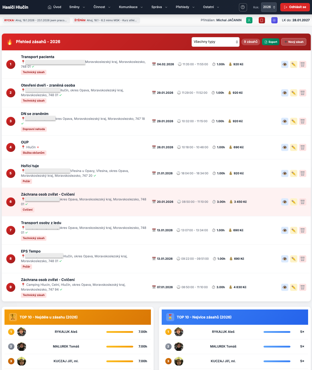 Po prihlásení do systému sa hasič dostáva na prehľadnú úvodnú obrazovku, ktorá mu okamžite ukazuje, či plní svoje povinnosti voči jednotke. Na jednom mieste vidí, koľko hodín má v danom mesiaci odslúžených, či absolvoval piatkovú skúšku techniky, či má splnené kondičné jazdy a či v poslednej dobe použil dýchaciu techniku v rámci chemickej služby.